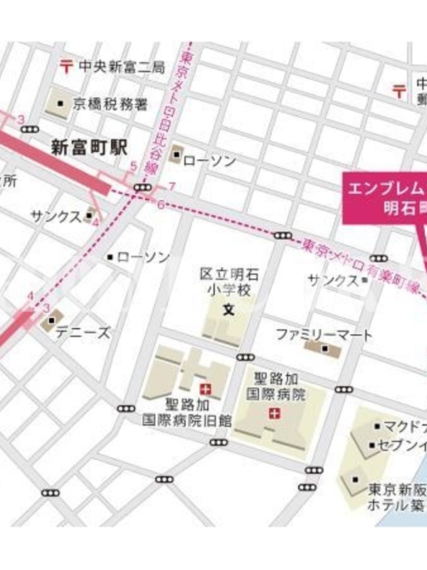 徒歩9分 東京メトロ有楽町線「月島」駅 徒歩8分 東京メトロ有楽町線「新富町」駅 徒歩8分 東京メトロ日比谷線「八丁堀」駅 徒歩12分 都営浅草線「東銀座」駅 徒歩19分 |