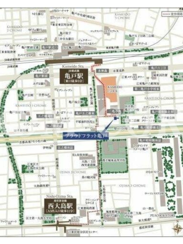 JR中央・総武線「亀戸」駅 徒歩5分 都営新宿線「西大島」駅 徒歩11分 都営新宿線「大島」駅 徒歩11分 東武亀戸線「亀戸水神」駅 徒歩12分 東京メトロ半蔵門線「錦糸町」駅 徒歩21分 |