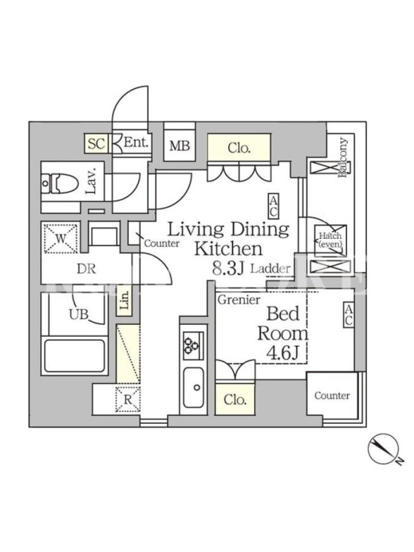 敷金1.0ヶ月、 北西向き、 広さ33.33平米のお部屋です。